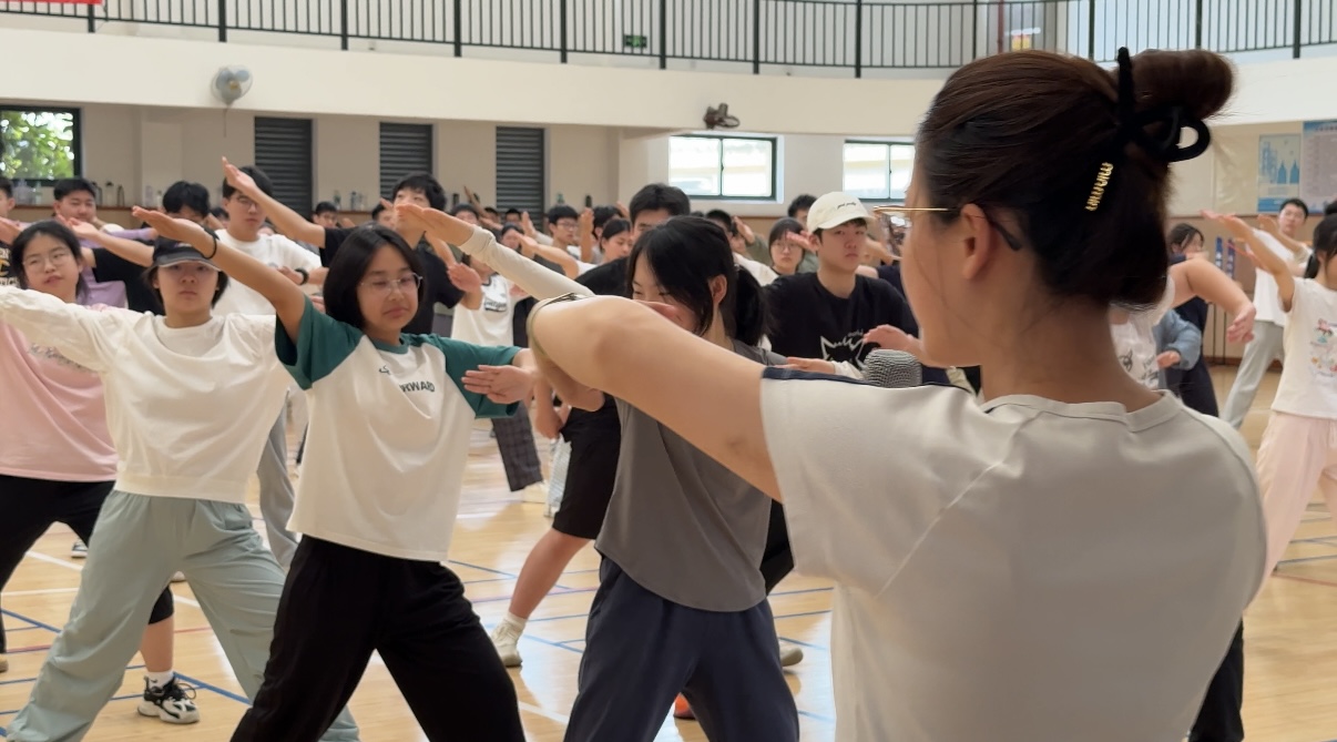 军训期间,学子们还练习广播操与学校特色武术操。如果说队列训练是意志的锤炼,那么广播操与武术操的练习则是力与美的融合。训练场上,同学们的动作从最初的参差不齐到如今的整齐划一,每一个伸展、踢腿、挥拳、劈掌都力求标准,尽显青春活力。