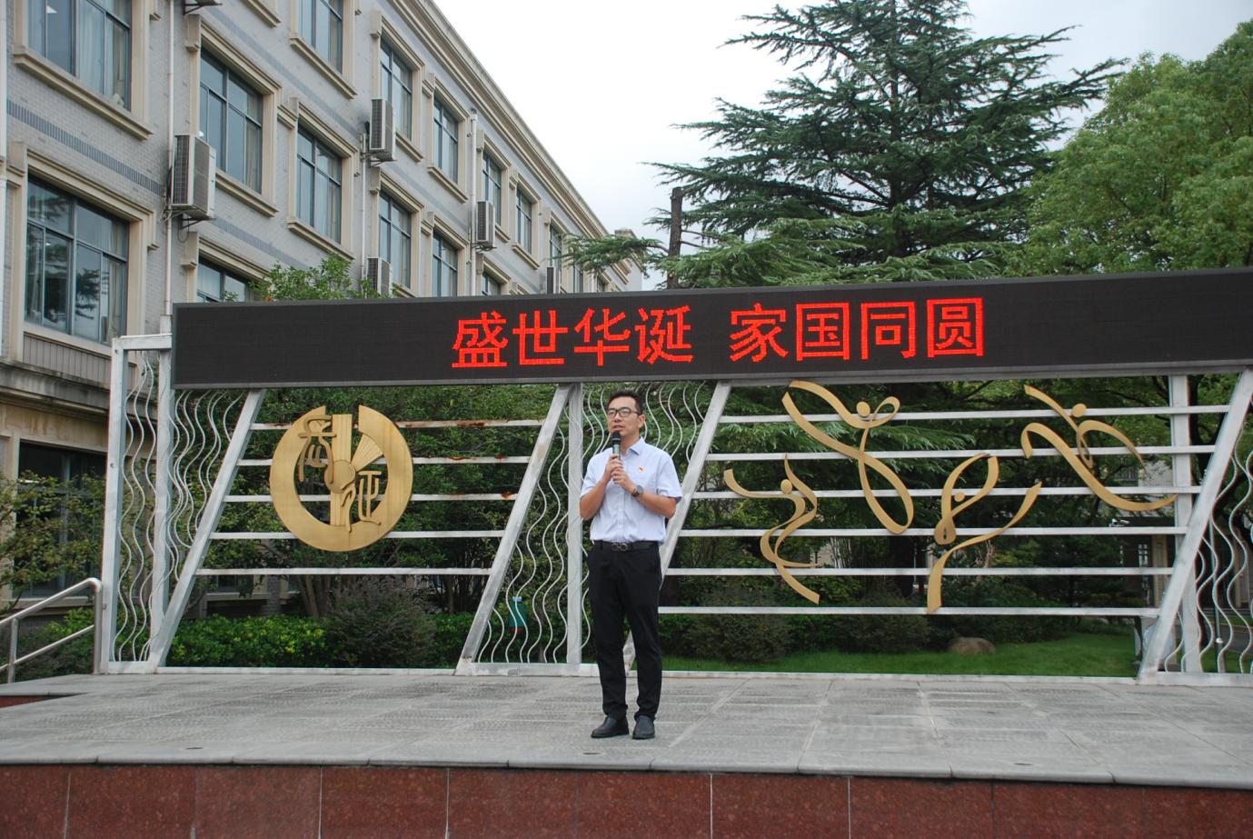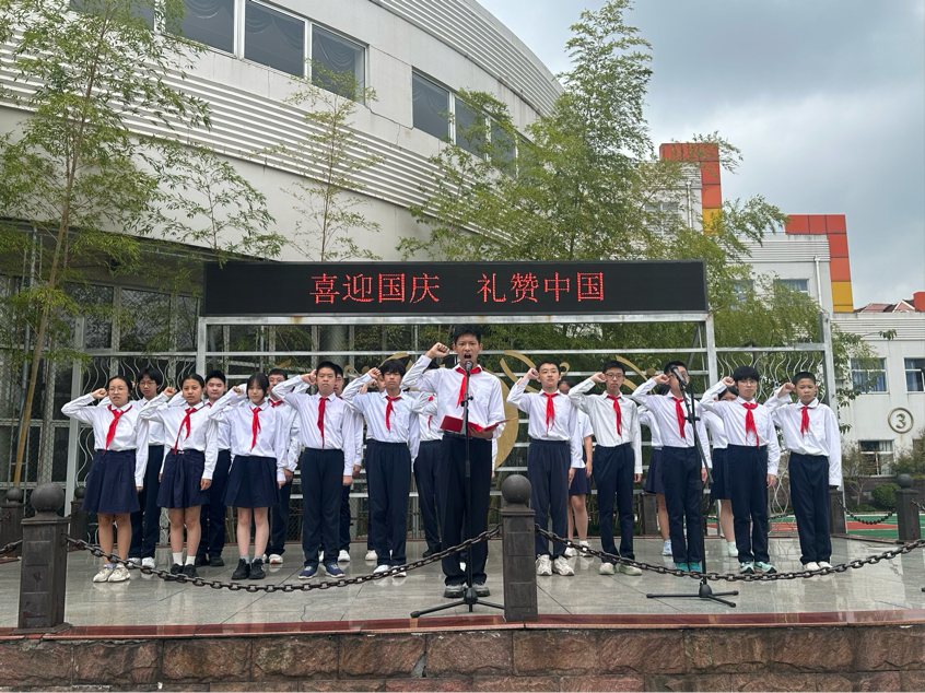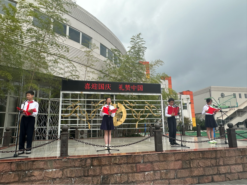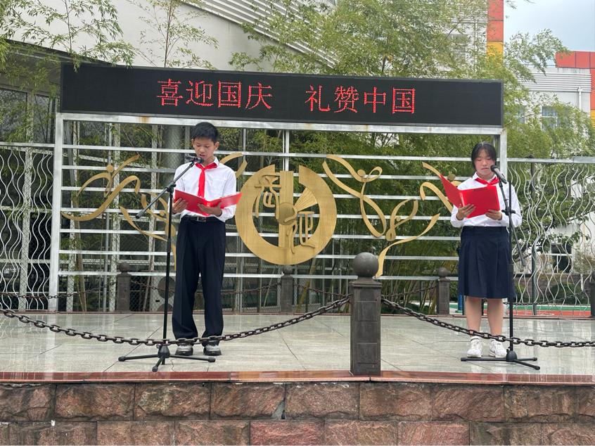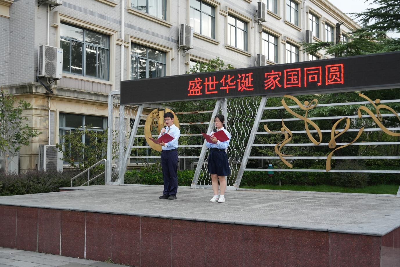 升旗仪式由顾晋嘉、刘明熙两位同学主持,“山河锦绣迎华诞,万众同心盼礼章”的开场瞬间将现场氛围带入对祖国华诞的期待与祝福中。