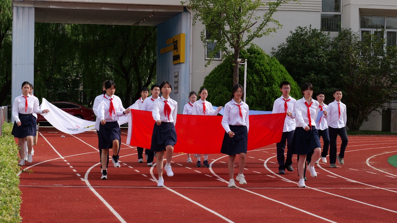 《分列式进行曲》奏响,国旗护卫队迈着铿锵有力的步伐护送五星红旗缓缓走来。鲜红的旗帜寄托着民族的希望,全场师生肃穆仰望,爱国之情与运动热情在心中交织奔涌。紧跟其后的是校旗与运动会会旗。