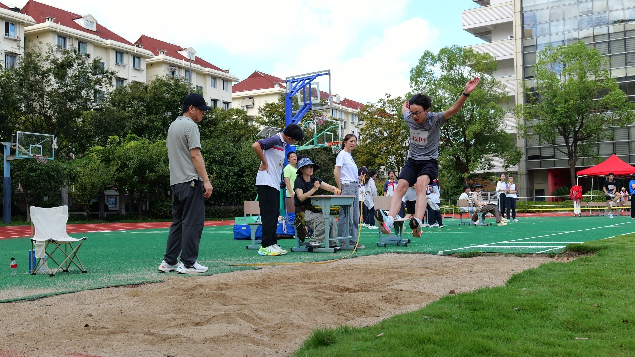 跳远区的沙坑旁,运动员们助跑、蹬地、腾空,整个动作一气呵成,身体在空中划出一道完美的抛物线,落地时溅起的沙粒,丈量着青春的力量与勇气。