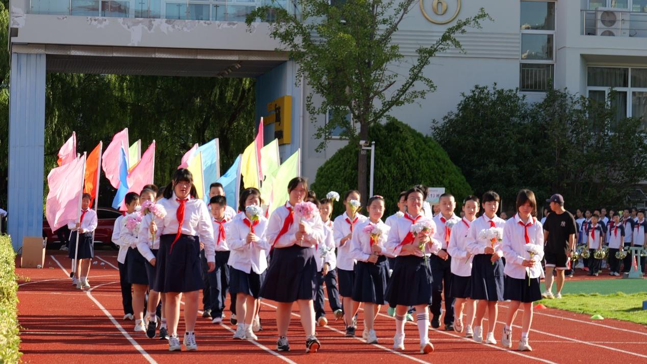 激昂的《运动员进行曲》如跳动的鼓点,瞬间点燃全场。率先亮相的鲜花队与彩旗队,宛如秋日画卷中跃动的精灵。六年级学子手捧的鲜花, 眼中闪烁着好奇与憧憬;七年级的彩旗方阵迎风而立,斑斓的旗帜翻涌如浪,将希望与活力铺满整个赛场。